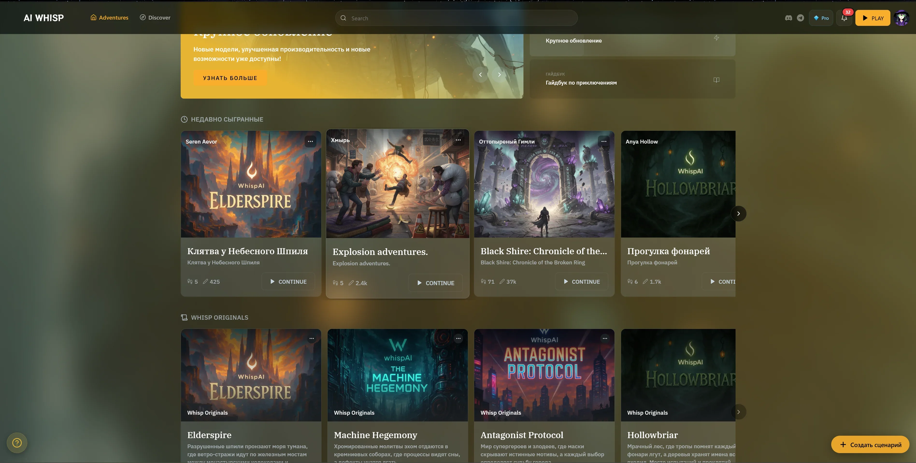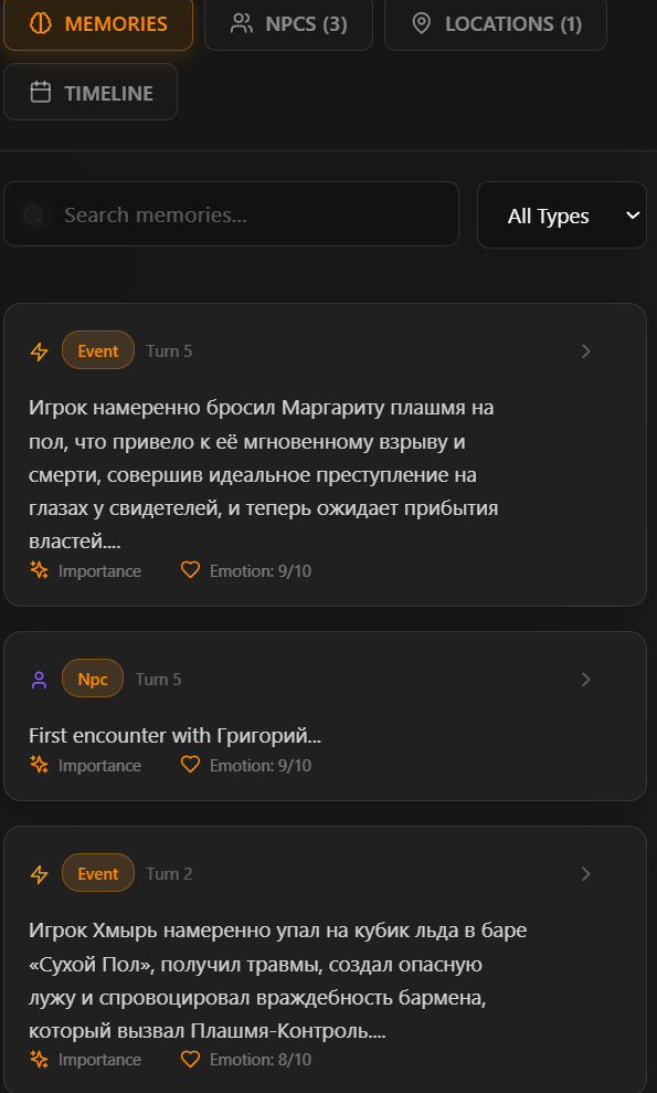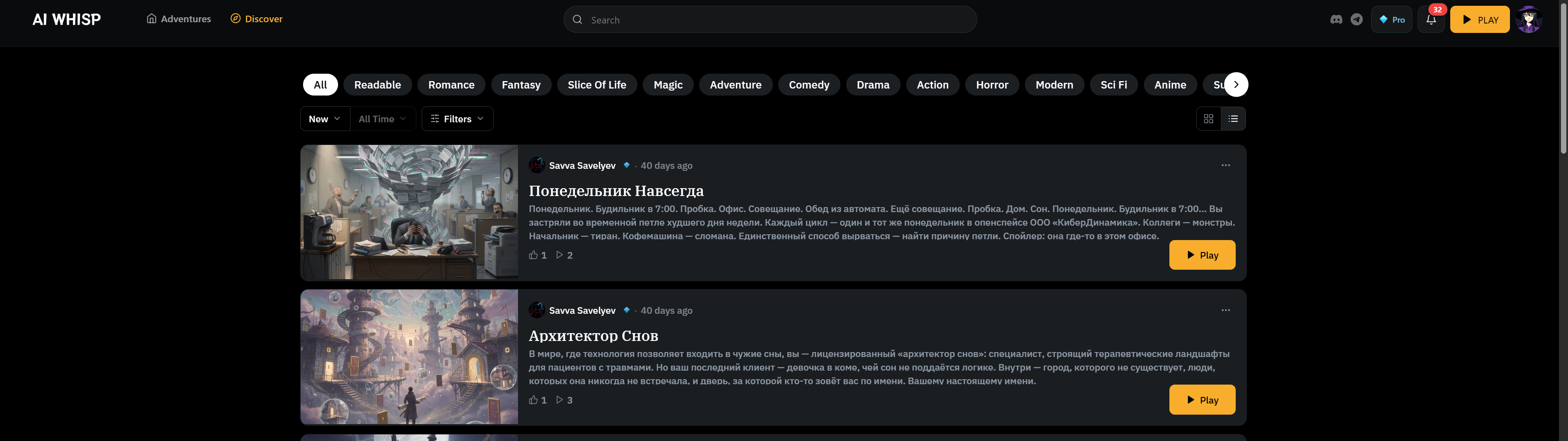 Главным желанием было - создать ощущение соучастия в связной истории. В ai-whisp реализован "нарративный движок" в котором ИИ является лишь рассказчиком, благодаря этому - целостность повествования не теряется, персонажи истории - сохраняются, включая прогресс отношений ГГ с ними.